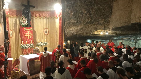 Enquanto o canto é entoado, o celebrante dirige-se ao local da celebração e permanece diante da cruz.